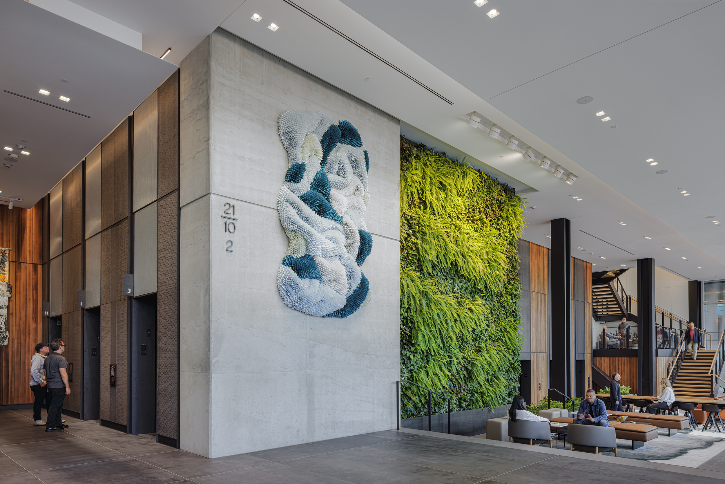 Lobby: Class A lobby with large format tile and stone floors. Lobby walls are a combination of wood, stone and architectural concrete with blackend steel accents featuring a fire place and living plant wall.